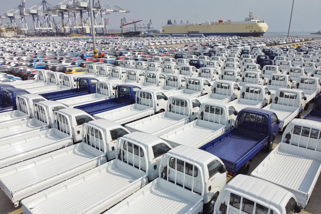 2022年3月7日,大批出口商品車在山東港口煙臺港集結等待裝船(無人機照片)。新華社發(唐克 攝)
