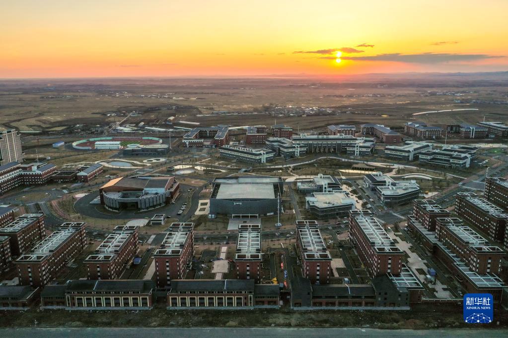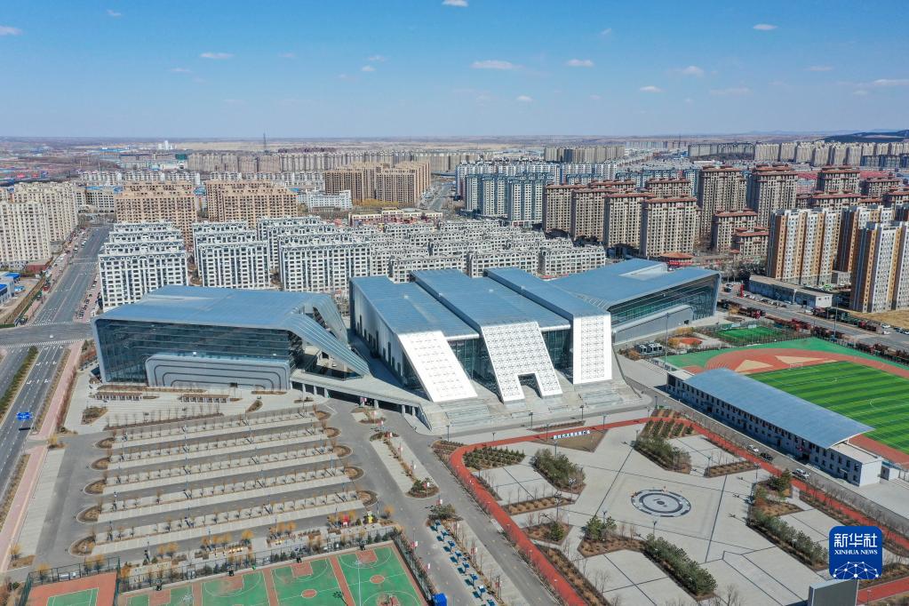 工人在進行吉林省長春市興隆山保稅區方艙隔離點一期施工建設(3月16日攝,無人機照片)。新華社發