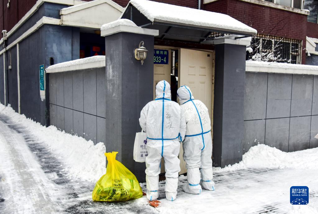 吉林省長春市朝陽區永昌街道社區工作人員挨門挨戶送“新冠病毒抗原自檢測試劑盒”(3月16日攝)。新華社記者 周長慶 攝
