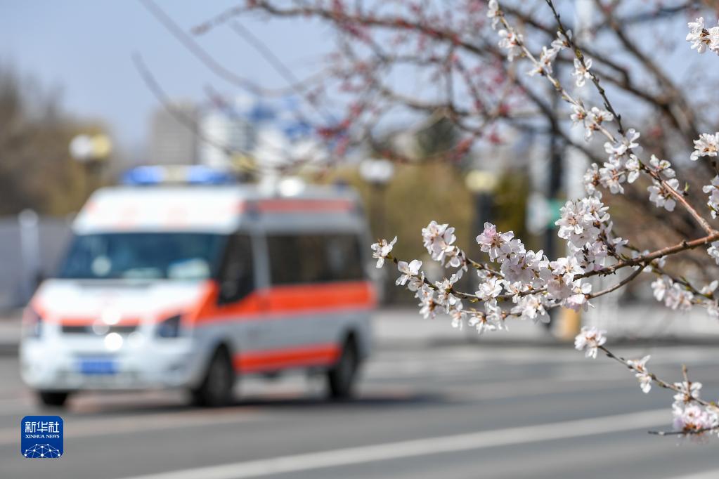 4月14日,一輛救護車在吉林省吉林市松江東路上駛過,路邊桃花已經盛開。新華社記者 張楠 攝