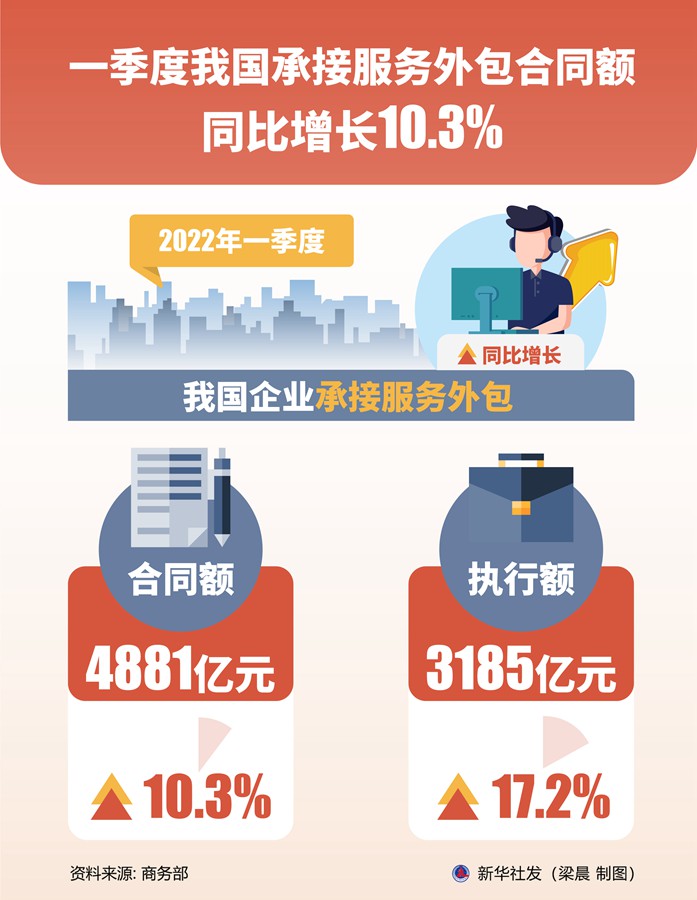 新華社北京4月14日電(記者謝?,帲┥虅詹啃侣劙l言人束玨婷14日介紹,今年一季度,我國企業承接服務外包合同額4881億元,執行額3185億元,同比分別增長10.3%和17.2%。