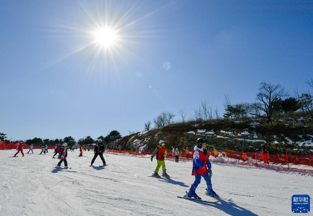在天津薊洲國際滑雪場,教練與小朋友在雪道上練習滑雪(2月20日攝)。新華社記者 孫凡越 攝