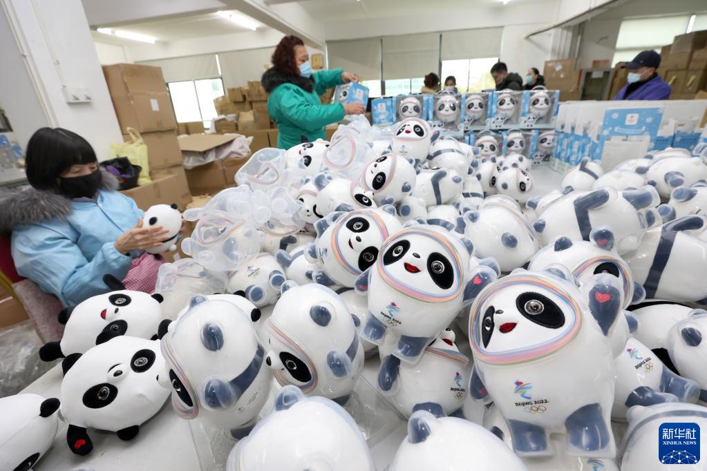 2月8日,工人在位于江蘇省啟東市的一家特許生產商的車間里包裝“冰墩墩”。新華社發(許叢軍 攝)
