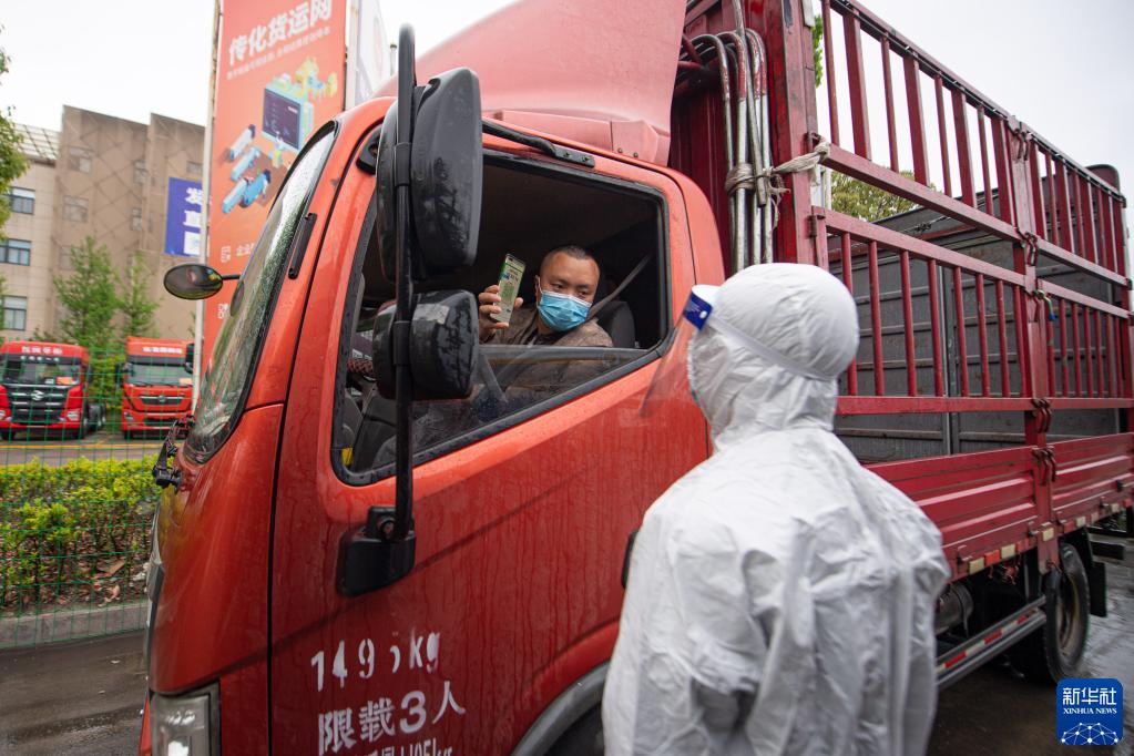 4月13日,工作人員查驗駛入杭州傳化公路港的貨車司機健康碼。新華社記者 江漢 攝
