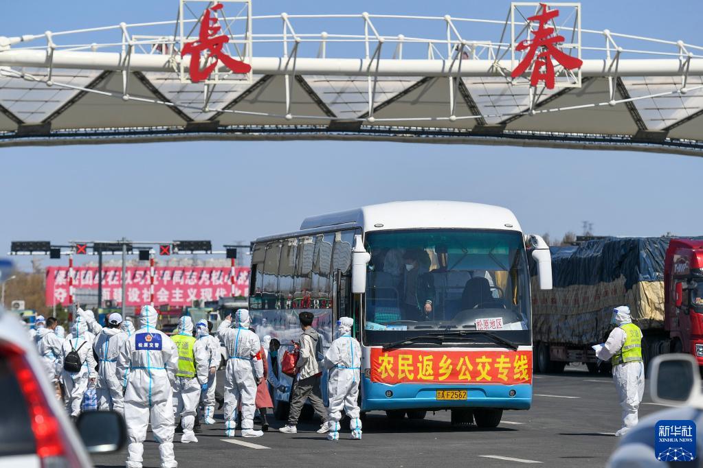 在吉林長春高速公路東出口,返鄉農民登上返鄉公交專線(4月12日攝)。新華社發