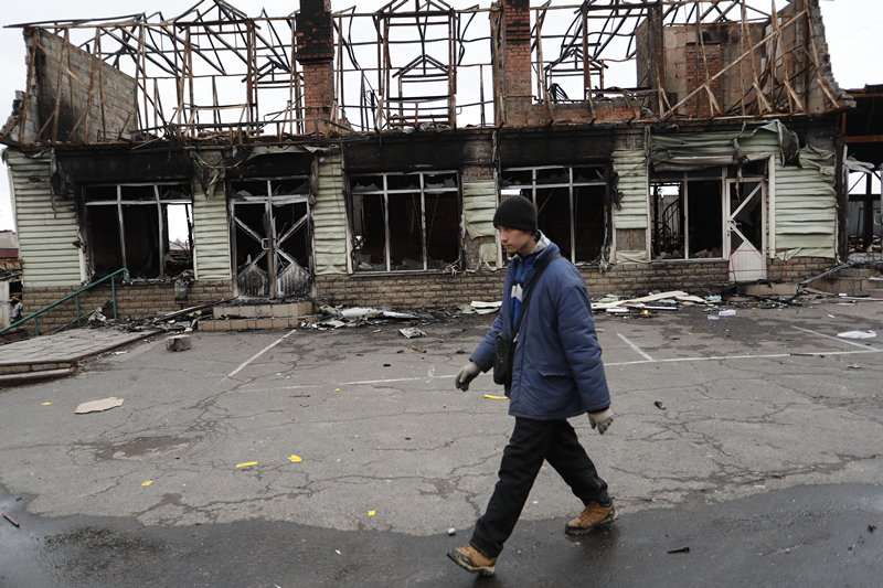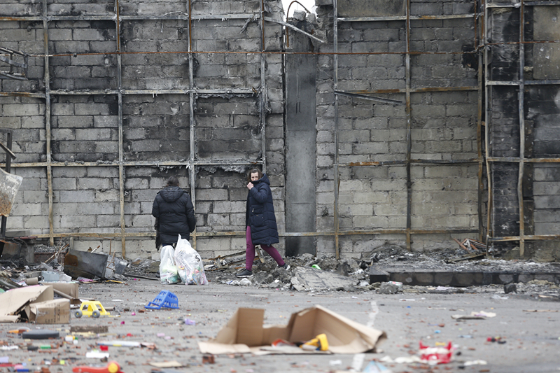 4月14日,馬里烏波爾當地居民從被損壞的建筑旁走過。新華社發(維克托攝)