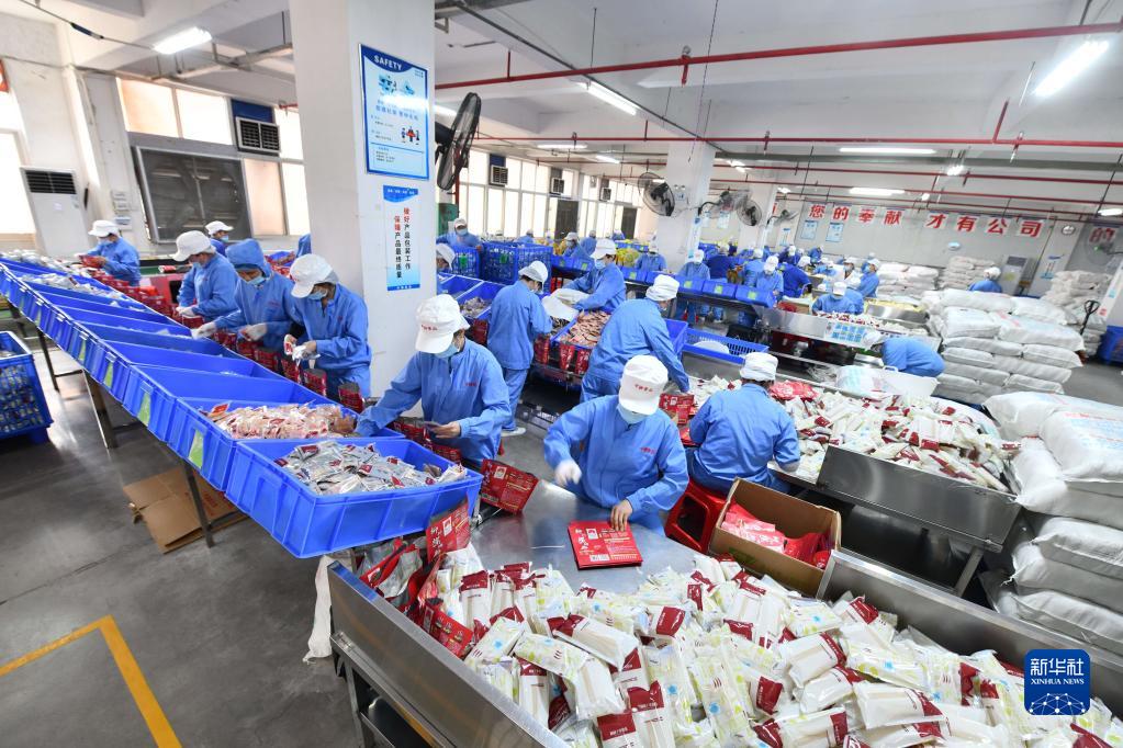 在廣西螺霸王食品有限公司生產車間,工人在生產線上包裝螺螄粉(4月11日攝)。新華社記者 黃孝邦 攝