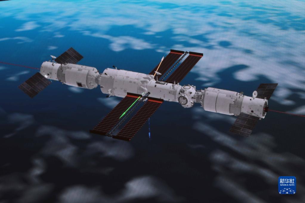 這是在北京航天飛行控制中心拍攝的天舟四號貨運飛船與空間站組合體完成自主快速交會對接示意圖(5月10日攝)。