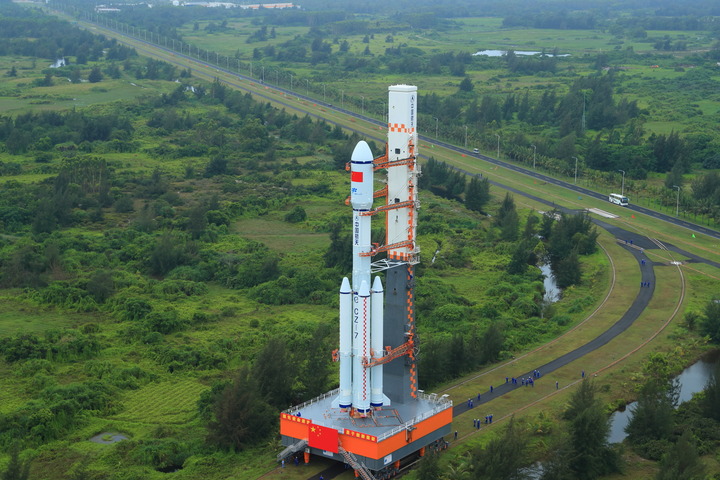5月7日,天舟四號貨運飛船與長征七號遙五運載火箭組合體在垂直轉運。新華社發(楊志遠 攝)