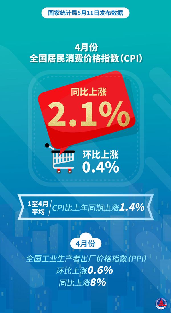 新華社北京5月11日電(記者申鋮、魏玉坤)國家統計局11日發布數據,4月份,全國居民消費價格指數(CPI)同比上漲2.1%,環比上漲0.4%。1至4月平均,CPI比上年同期上漲1.4%。