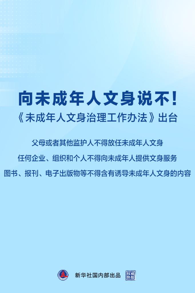 新華社北京6月6日電(記者高蕾)國務院未成年人保護工作領導小組辦公室6日印發《未成年人文身治理工作辦法》,要求任何企業、組織和個人不得向未成年人提供文身服務,不得脅迫、引誘、教唆未成年人文身。