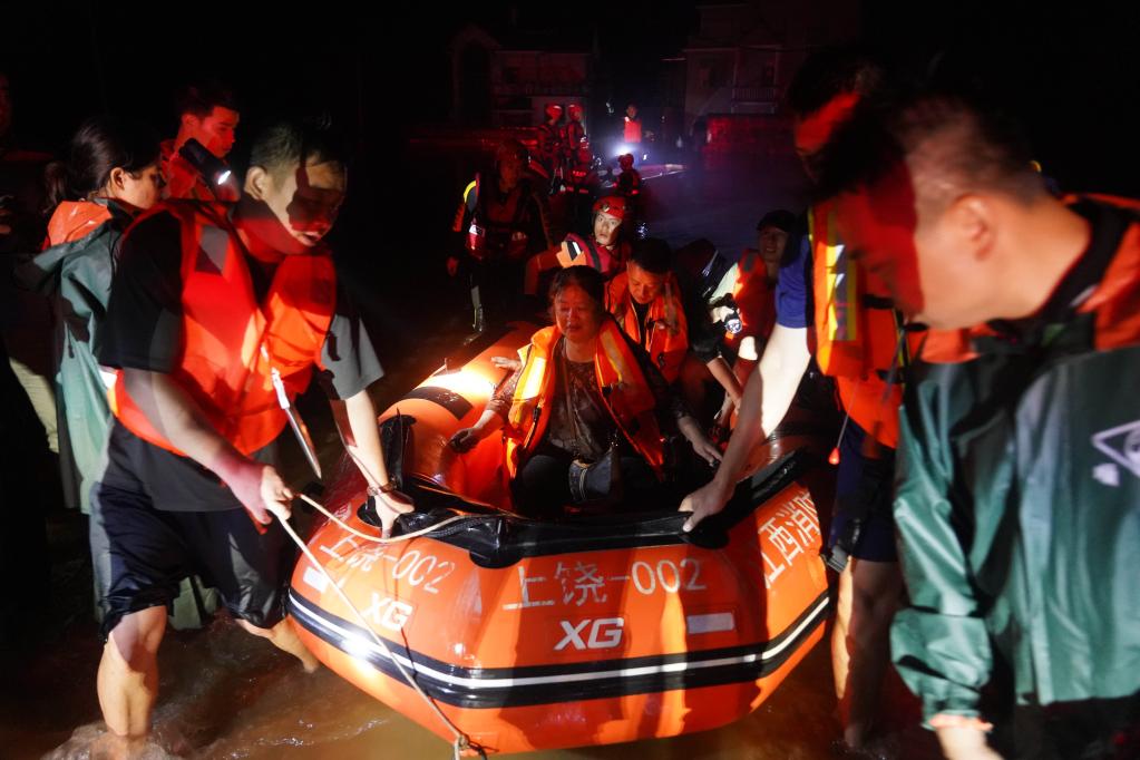 6月20日,德興市泗洲鎮,救援人員乘坐沖鋒舟進入村莊轉移被困人員。新華社記者 周密 攝