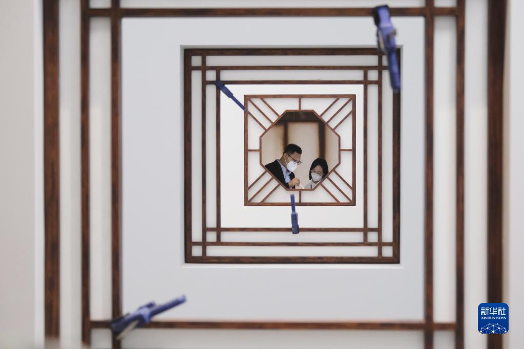 2022年4月22日,香港故宮文化博物館藏品修復專家梁嘉放(右)和呂智超在展廳內工作。 新華社記者 王申 攝