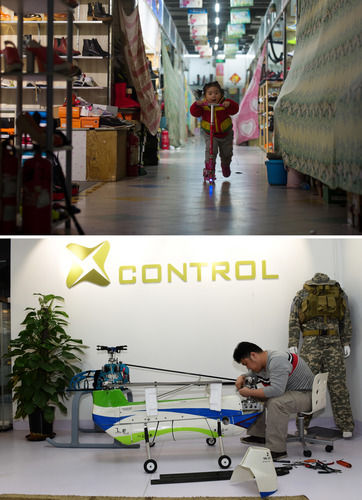 拼版照片:上圖為一名小朋友在地處北京動物園附近的空蕩的天皓成服裝批發市場玩耍(2015年1月12日攝);下圖為一家無人機開發企業的工作人員在由天皓成服裝批發市場轉型的寶藍金融創新中心工作(2018年4月3日攝)。新華社記者羅曉光攝