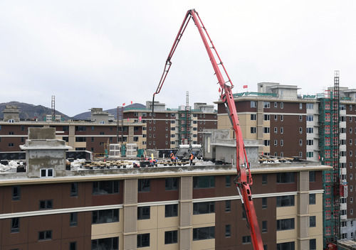 建設者在北京市海淀區西北旺鎮的共有產權住房永靚家園施工現場作業(2020年3月26日攝)。新華社記者任超攝