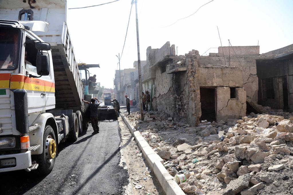 7月4日,工人在伊拉克摩蘇爾老城給馬路鋪瀝青。新華社發(哈利勒·達伍德攝)