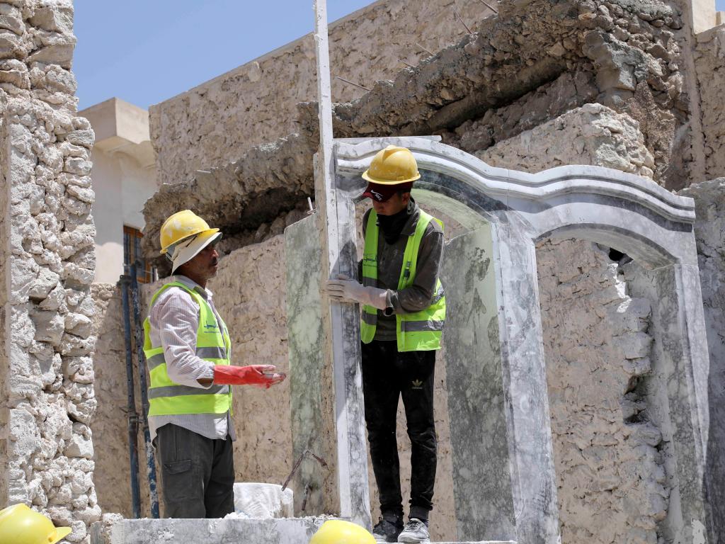 7月3日,工人在伊拉克摩蘇爾老城參與努里清真寺的修復施工。新華社發(哈利勒·達伍德攝)