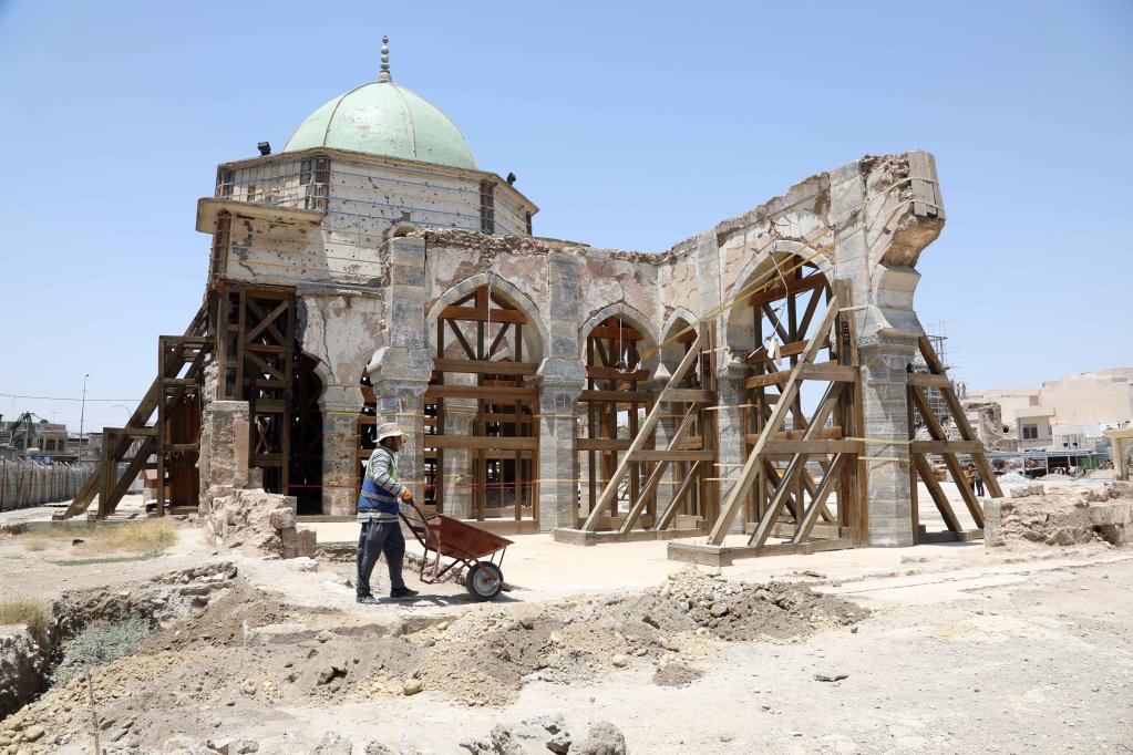 7月的摩蘇爾最高氣溫超過45攝氏度,炎炎烈日下,工人們正對努里清真寺進行修復施工。5年前,潰敗的“伊斯蘭國”武裝分子炸毀了這座擁有800多年歷史的地標建筑。2018年伊拉克政府與聯合國教科文組織和阿聯酋政府簽訂協議,重建努里清真寺。