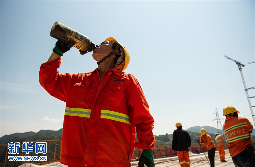 在景文高速控制性工程高嶺頭水庫特大橋施工現場,“到中午時,在大橋上面沒有遮擋,氣溫達到40攝氏度以上。但不管有多苦多累,我們都要保質保量,爭取早日把這項目建成?!睗仓と朔鹅魳s說。為了預防中暑,工人們的訣竅就是多喝水,他們每個人每天帶著兩公升的水壺,每天要喝兩三壺。