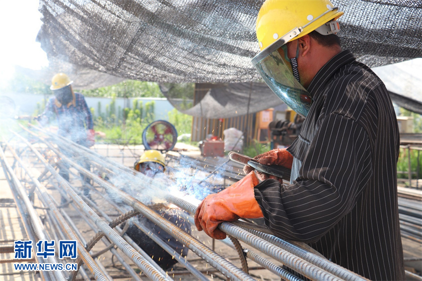 在義東高速1標白云互通施工現場,30多名班組工人開展支架搭設、鋼筋綁扎、焊接等工作?!白罱鼘嵲谔珶崃?,我們就把(每天的)工作時間提前了?!变摻罟ず喂鹈酪贿吔変摻?,一邊說,綁扎鋼筋是在給后續混凝土澆筑工作做鋪墊,必須要快,但這樣的大熱天,確實戴著手套都燙手,不過為了工作,大家都習慣了。因為暴露在太陽下工作,何桂美臉頰已被炙烤得通紅。