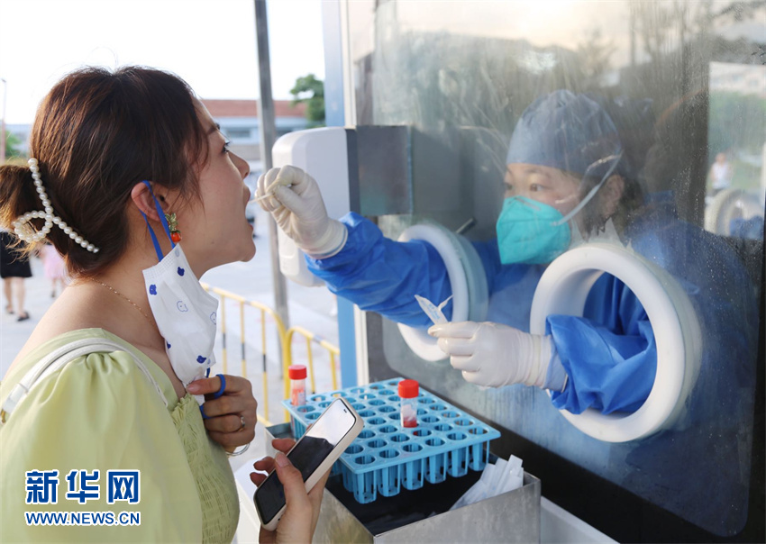 在臺州玉環市龍溪鎮花巖浦文化禮堂、龍溪公園等便民核酸采樣點,醫務人員、黨員志愿者身穿防護服、冒著高溫有序地進行核酸采樣。