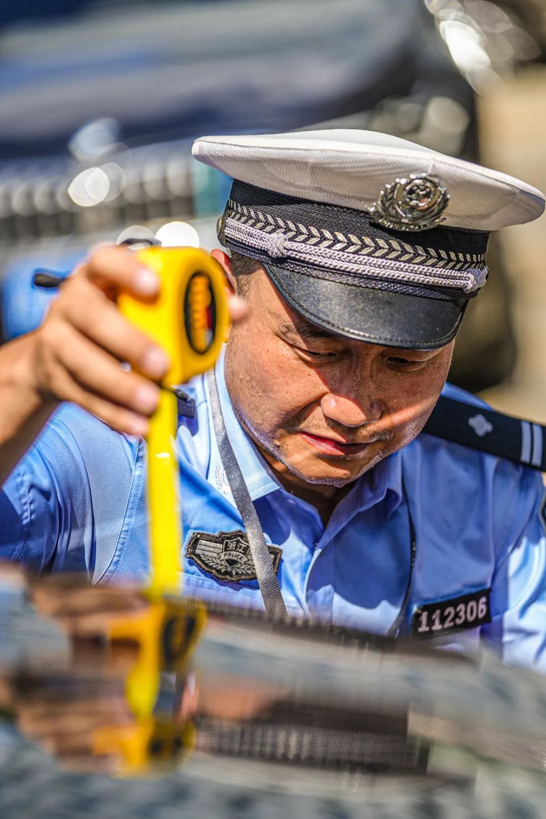 杭州交警西湖大隊民警蔣亮亮在事故現場開展勘查工作。