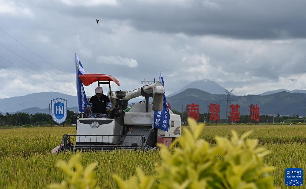 在三亞市崖州區(壩頭)南繁公共試驗基地試驗示范點稻田,工作人員操作收割機收割水稻(2022年5月6日攝)。新華社記者 楊冠宇 攝