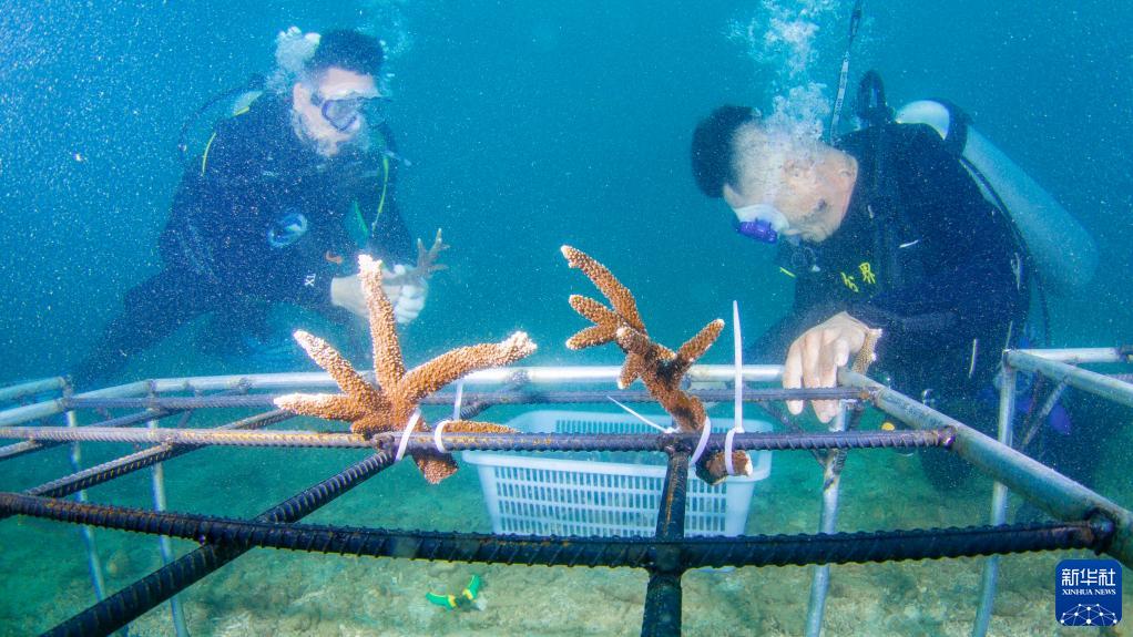 海南省海洋與漁業科學研究院的專家和分界洲島旅游區工作人員在海南省陵水黎族自治縣分界洲島附近海域移植珊瑚(2022年6月7日攝)。新華社記者 張麗蕓 攝