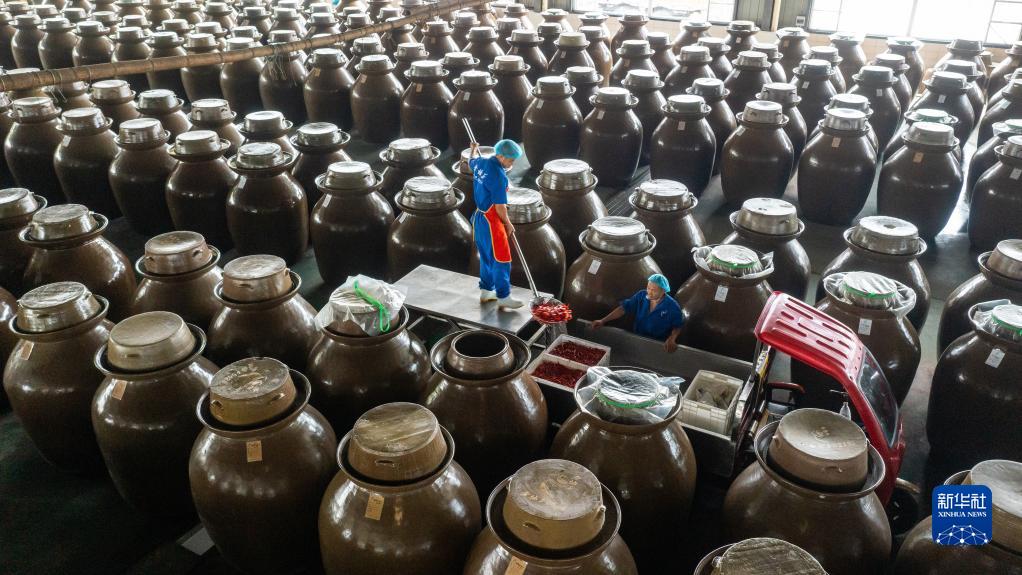 位于四川省眉山市的四川老壇子食品有限公司的工人在撈取已經腌制好的泡菜(2022年6月24日攝,無人機照片)。新華社記者 沈伯韓 攝