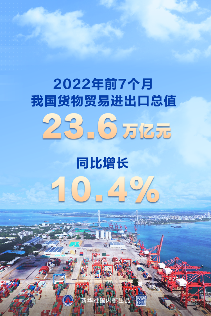 新華社北京8月7日電(記者鄒多為)海關總署7日發布數據,今年前7個月,我國貨物貿易進出口總值23.6萬億元,同比增長10.4%。外貿克服諸多不利影響,實現較快增長。