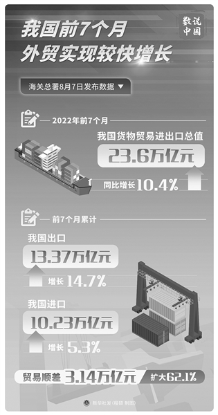 8月7日,海關總署發布數據顯示,今年前7個月,我國進出口總值23.6萬億元人民幣,比去年同期增長10.4%。其中,7月份進出口總值3.81萬億元,同比增速進一步提升為16.6%。