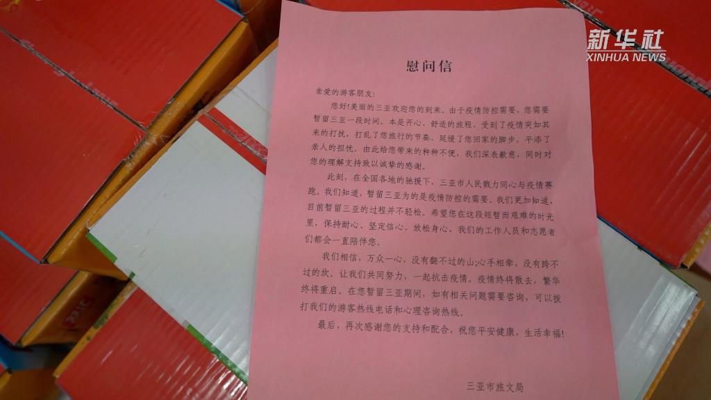 在“愛心包”里,記者看到了一封來自三亞市旅文局給滯留游客的慰問信,信中寫道:“目前暫留三亞的過程并不輕松,希望您在這段短暫而艱難的時光里,保持耐心、堅定信心、放松身心,我們的工作人員和志愿者們都會一直陪伴您?!?/p>