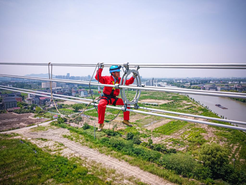 電力工人對白鶴灘——浙江±800千伏特高壓直流輸電工程線路進行走線驗收。無人機照片 新華社記者 江漢 攝