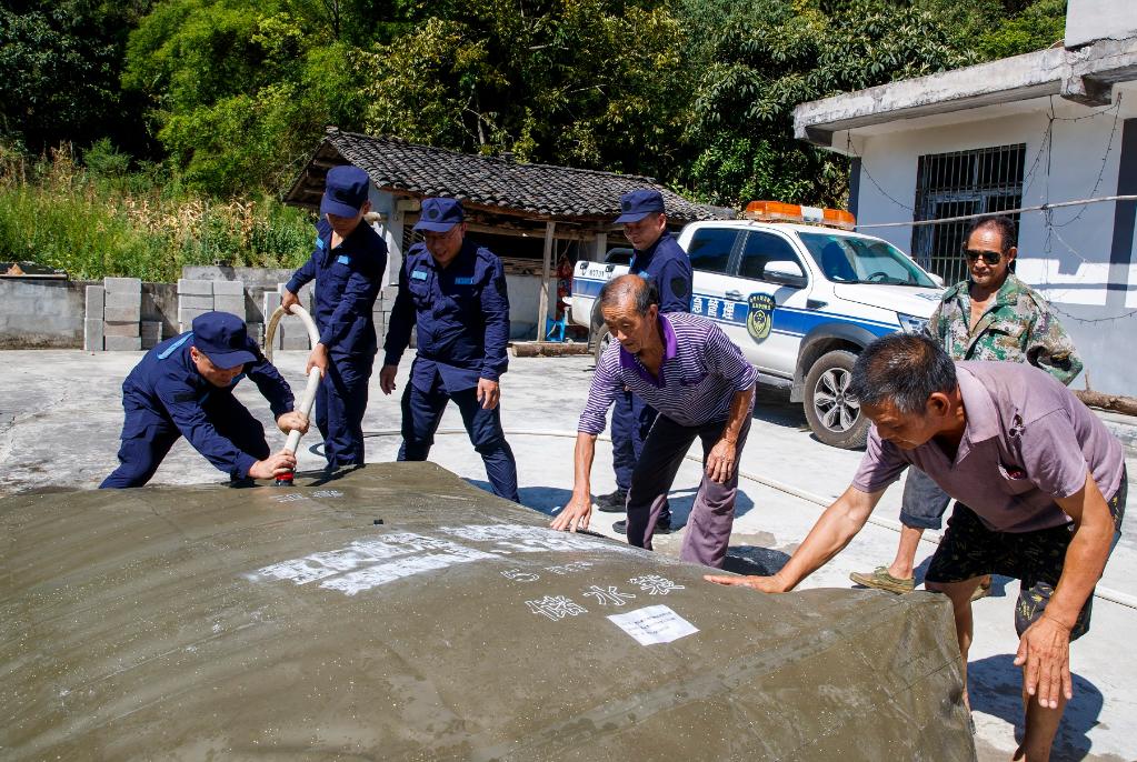 重慶南川區綜合應急救援隊調配儲水袋進村送水。甘昊旻 攝