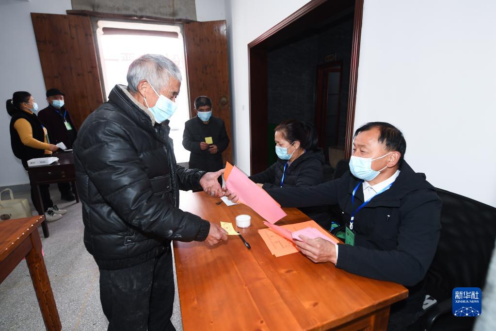 村民在浙江省杭州市臨安區湍口鎮迎豐村的基層投票點領取選票參加基層人大換屆選舉投票(2021年12月14日攝)。新華社記者 徐昱 攝