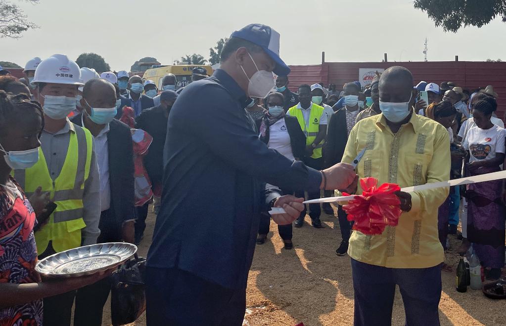 6月30日,在安哥拉卡賓達省供水項目現場,安能源和水利部部長博爾赫斯(前左)和卡賓達省省長尼溫加在竣工典禮上剪彩。新華社發(中國鐵建二十局集團供圖)