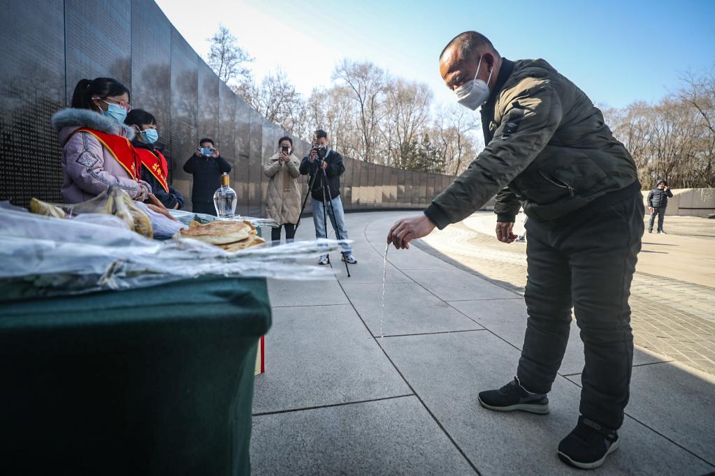 3月5日,展志忠的孫子展保成在沈陽抗美援朝烈士陵園英名墻前祭祀自己的爺爺展志忠烈士。新華社記者 潘昱龍 攝