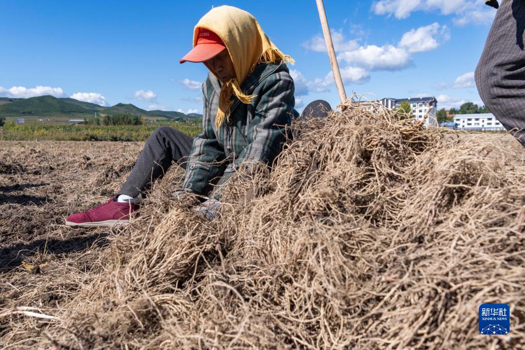 9月19日,在黑龍江勃利縣一中草藥種植基地,當地農民對剛收獲的白薇進行初步清理。