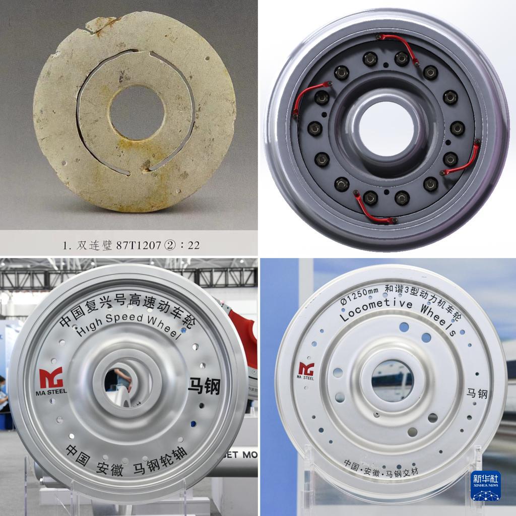 這是一張拼版照片:左上為凌家灘遺址出土的雙連璧(凌家灘遺址管理處供圖);右上為一款馬鋼彈性車輪(寶武集團馬鋼軌交材料科技有限公司供圖);左下為2022世界制造業大會上展出的中國復興號高速動車輪模型(新華社記者張端2022年9月20日攝);右下為2022世界制造業大會上展出的和諧3型動力機車輪模型(新華社記者黃博涵2022年9月20日攝)。