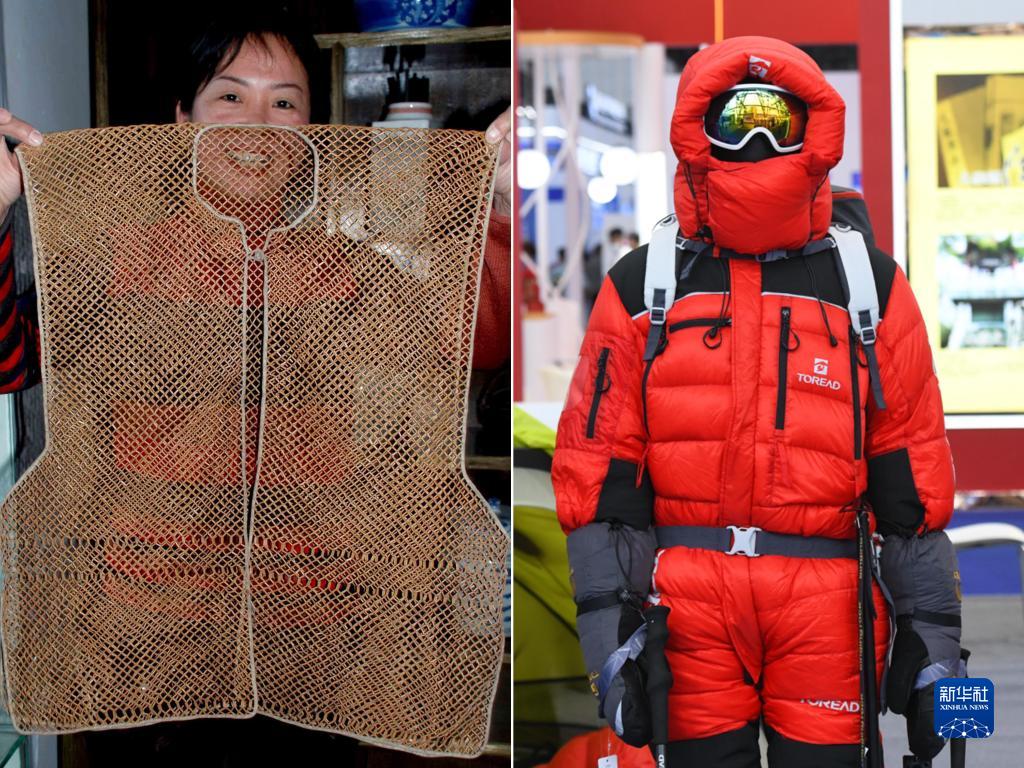 這是一張拼版照片:左圖為2009年1月3日在江西省婺源縣拍攝的清代竹衣馬甲(王國紅攝);右圖為2022世界制造業大會上展出的一款填充了高科技材料的服裝(新華社記者周牧2022年9月20日攝)。