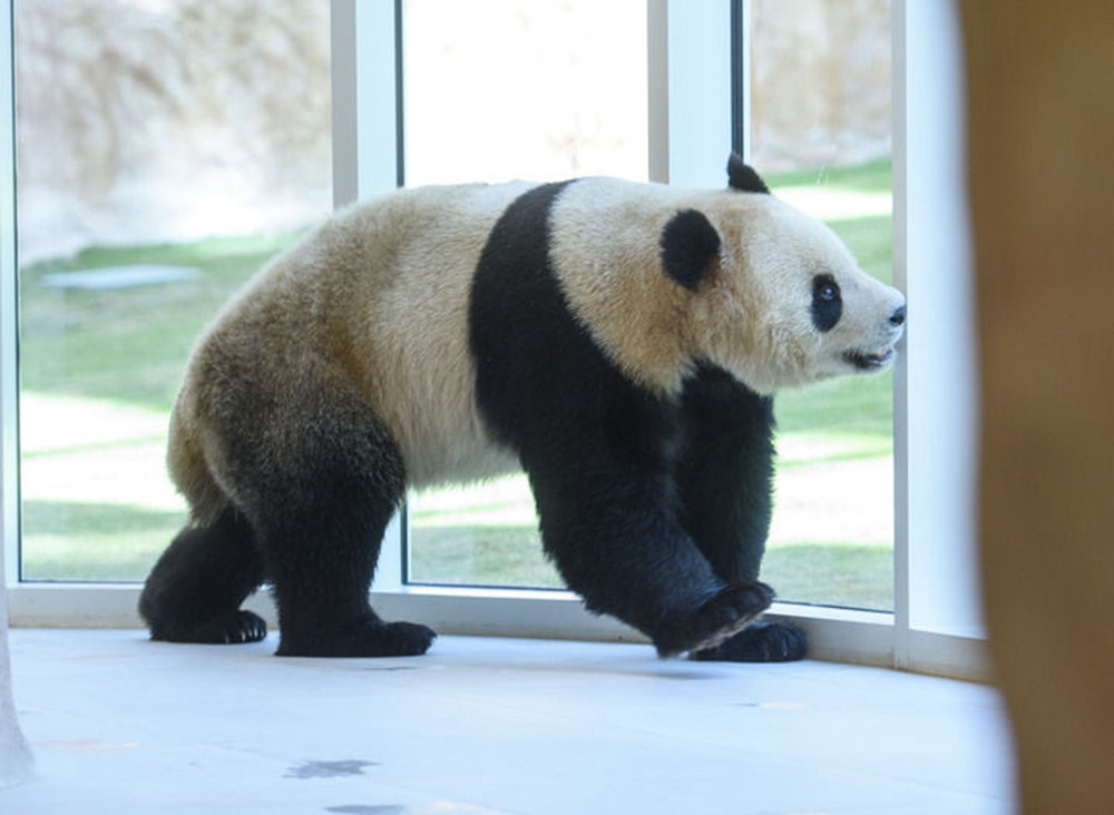 10月19日,大熊貓走在位于卡塔爾首都多哈的豪爾熊貓館內。新華社發(尼庫攝)