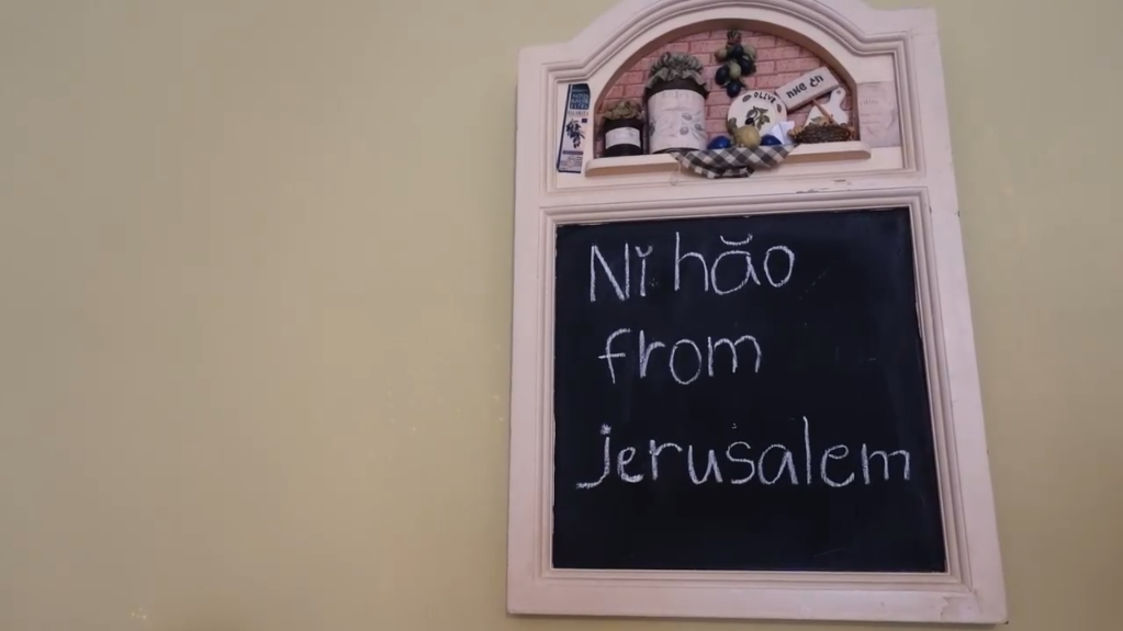 拉維家中寫著“你好,來自耶路撒冷”的小黑板。視頻截圖
