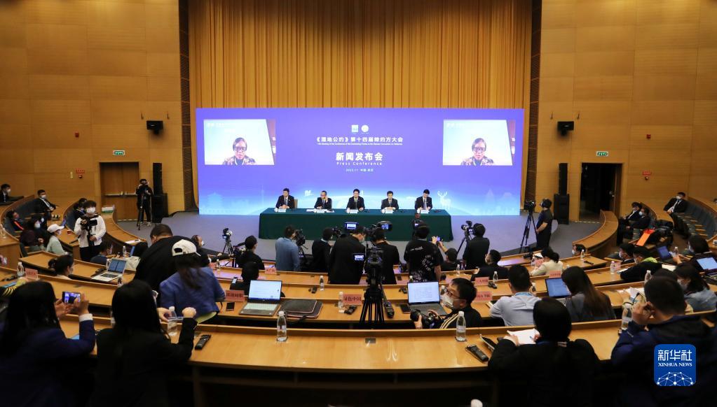 這是11月6日在湖北武漢拍攝的《濕地公約》第十四屆締約方大會新聞發布會現場。新華社記者 姚琪琳 攝