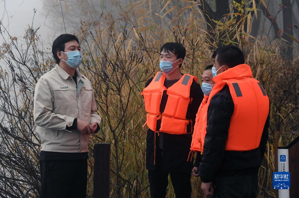 11月11日,在翠湖國家城市濕地公園,張庚(左一)在巡視中向水上作業的工作人員明確安全要求。