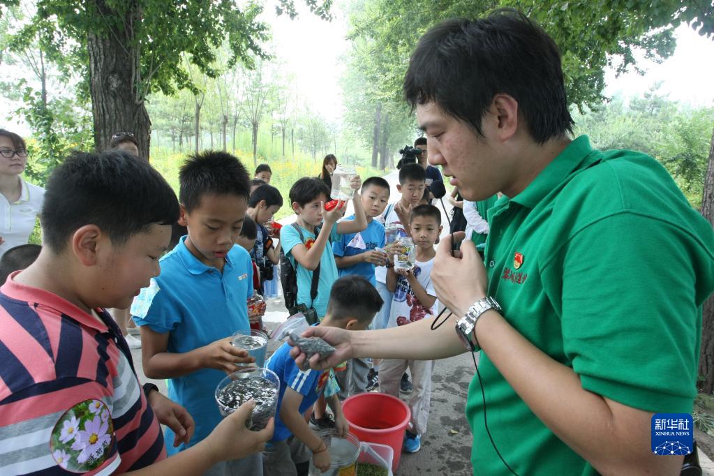 在翠湖國家城市濕地公園,張庚(右一)在科普活動中為小朋友們講解(2016年7月9日攝)。