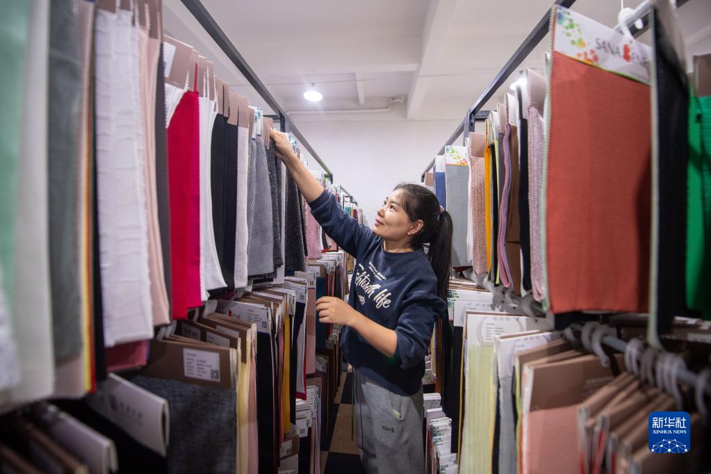 11月2日,工作人員在柯橋區一家紡織產業公司的樣品庫房內整理面料樣品。