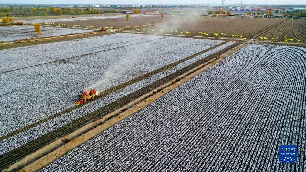 采棉機在新疆沙雅縣海樓鎮的棉田里采收棉花(11月10日,無人機照片)。