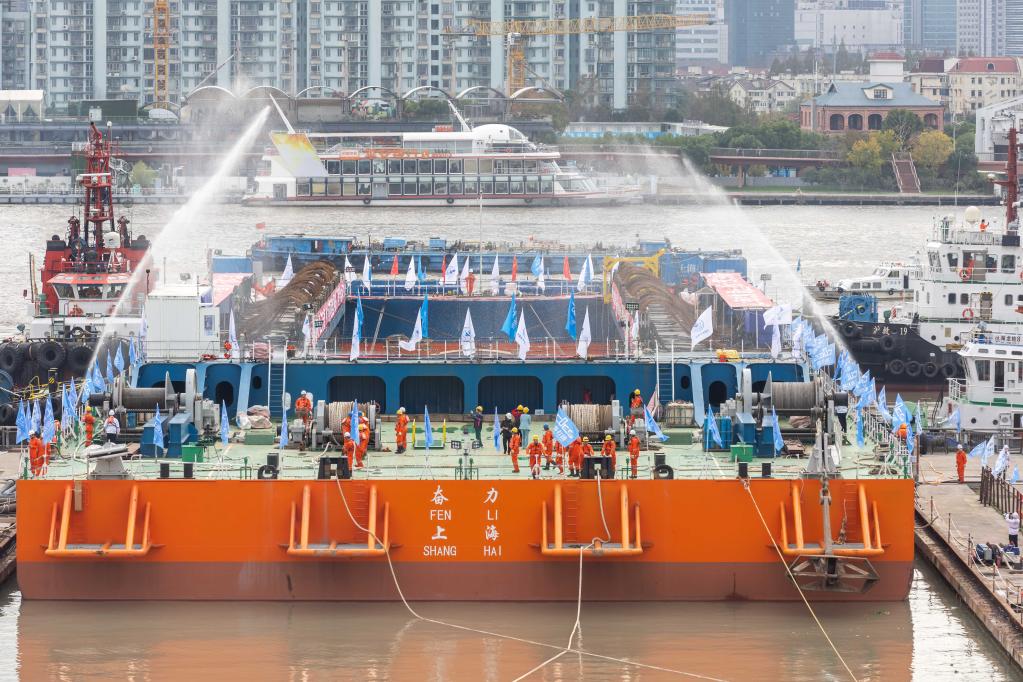 25日13時30分,“奮力”輪順利“入塢”,弧形梁考古沉箱精準安放于“馬鞍座”上,宣告長江口二號古船整體打撈遷移完成,接下來將啟動考古發掘、文物整體保護和博物館規劃建設工程。