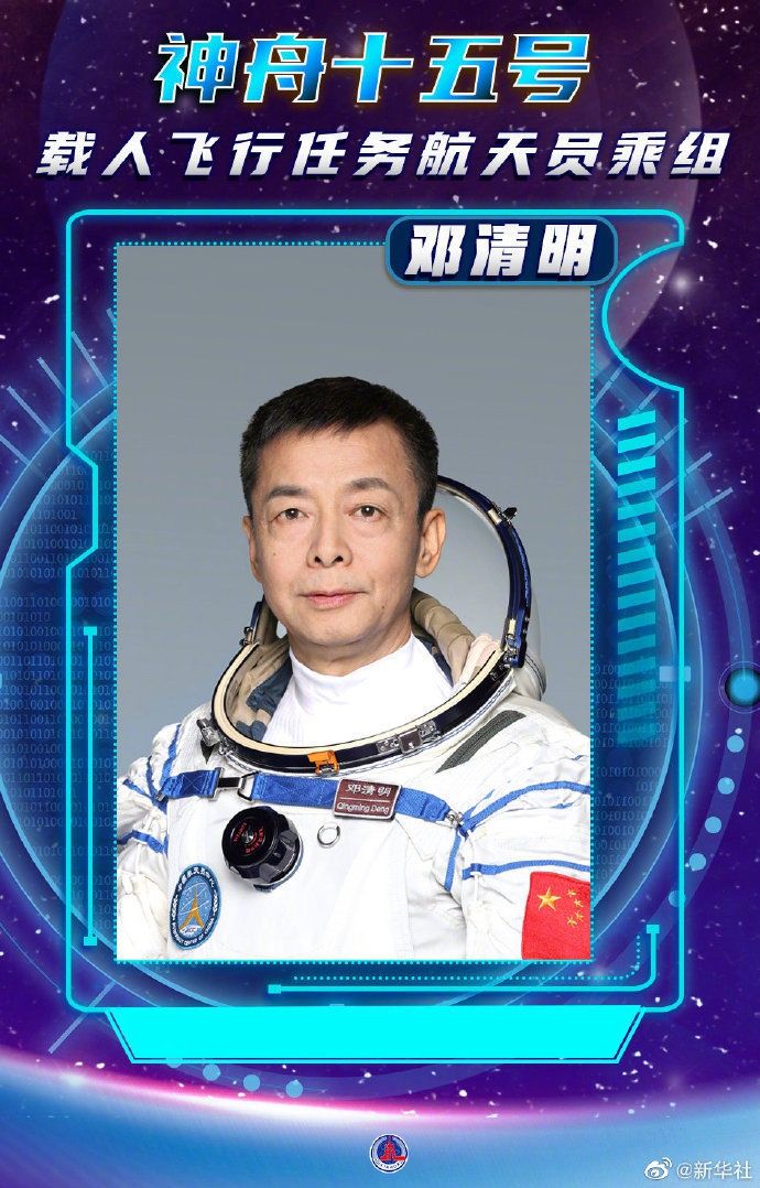 【鄧清明同志簡歷】鄧清明,男,漢族,籍貫江西宜黃,中共黨員,碩士學位。1966年3月出生,1984年6月入伍,1988年10月加入中國共產黨,現為中國人民解放軍航天員大隊特級航天員,大校軍銜。曾任空軍某師某團某飛行大隊副大隊長,被評為空軍一級飛行員。1998年1月入選為我國首批航天員。經全面考評,入選神舟十五號載人飛行任務乘組。(記者黃明、李國利、張汨汨)