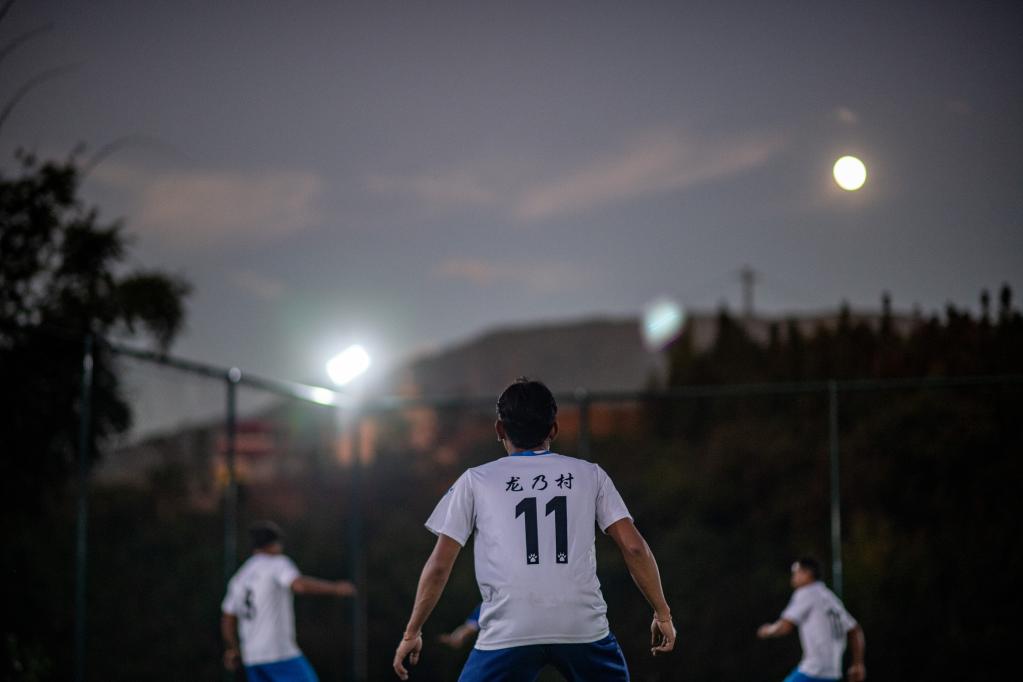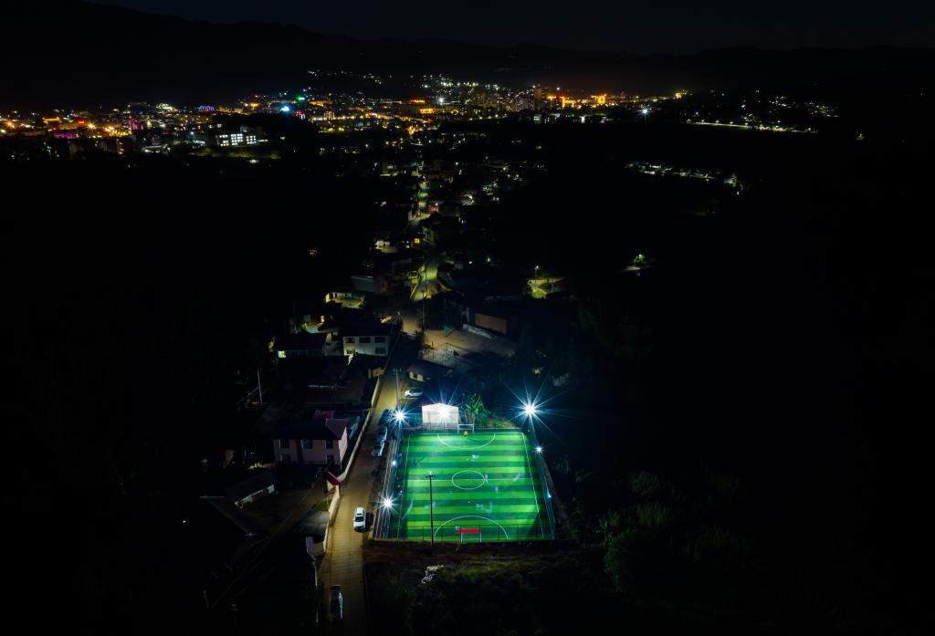 夜色中的云南省滄源佤族自治縣龍乃村足球場(無人機照片)。